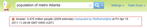 Users of the up-and-coming search site DuckDuckGo know that the site is unique because it doesn’t track history, contains less spam, features a cute bow tie-wearing duck, and provides zero-click information that immediately pops up under the search box. Since the release of the Wolfram|Alpha API, DuckDuckGo has been gradually integrating Wolfram|Alpha’s computational knowledge engine into its offerings, providing users with dynamically computed facts.
